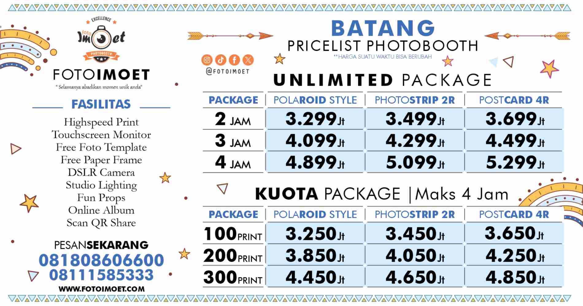 Batang - Ada 2 layanan harga photo booth murah terdekat di Kabupaten Batang dari FOTOIMOET yaitu Paket photo booth unlimited dan Photo Booth Kuota, perbedaan nya ada di jam operasional dan banyak lembaran foto yang di cetak. Paket yang jumlah pemotretan tidak terbatas adalah photobooth unlimited, kamu bisa sepuasnya foto dan bergaya di depan kamera selama waktu operasional di paket harga photo booth unlimited Batang yang di pesan.