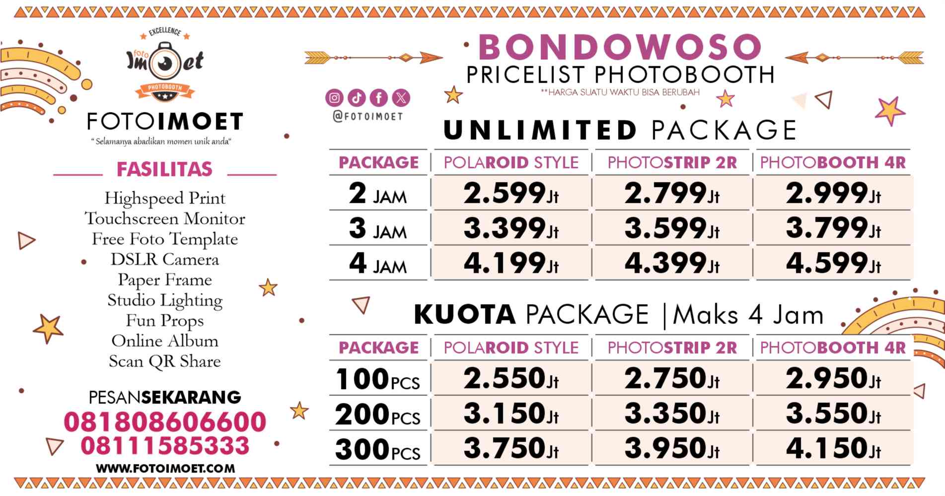 Bondowoso - Ada 2 layanan harga photo booth murah Bondowoso dari FOTOIMOET yaitu Paket photo booth unlimited dan Photo Booth Kuota, perbedaan nya ada di jam operasional dan banyak lembaran foto yang di cetak. Paket yang jumlah pemotretan tidak terbatas adalah photobooth unlimited, kamu bisa sepuasnya foto dan bergaya di depan kamera selama waktu operasional di paket harga photo booth unlimited Bondowoso yang di pesan.