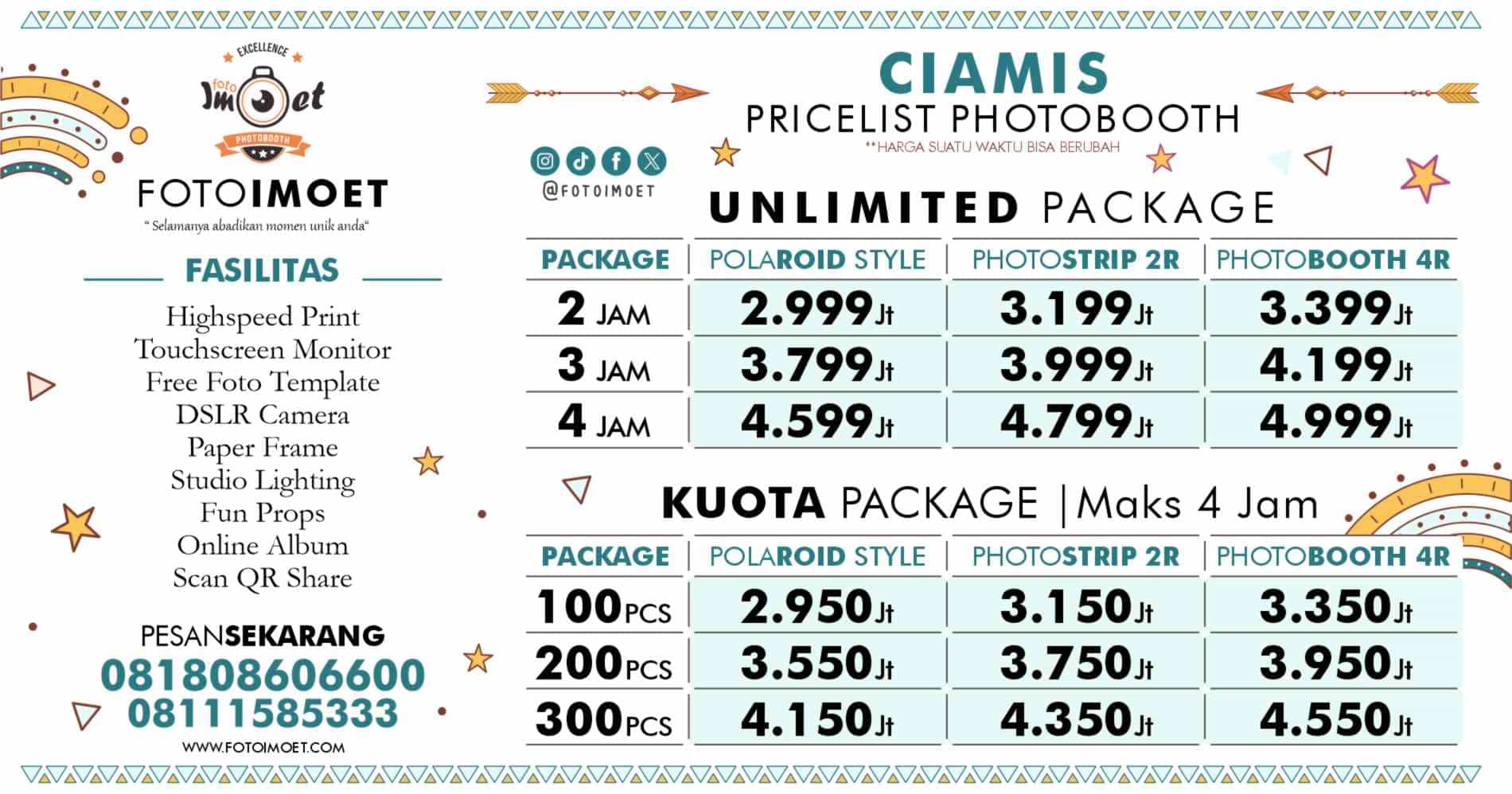 Ciamis - Ada 2 layanan harga photo booth murah Ciamis dari FOTOIMOET yaitu Paket photo booth unlimited dan Photo Booth Kuota, perbedaan nya ada di jam operasional dan banyak lembaran foto yang di cetak. Paket yang jumlah pemotretan tidak terbatas adalah photobooth unlimited, kamu bisa sepuasnya foto dan bergaya di depan kamera selama waktu operasional di paket harga photo booth unlimited Ciamis yang di pesan.