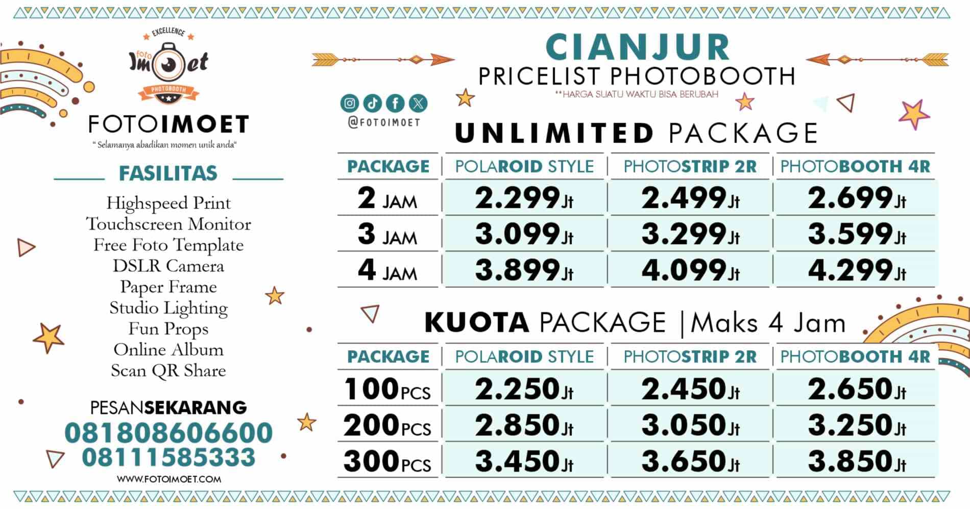 Harga sewa photobooth untuk wedding & event di Cianjur. Tersedia paket Unlimited & Kuota dengan hasil cetak cepat dan paper frame gratis. Harga mulai dari Rp 2.250.000 maksimal durasi 4 jam kuota 100.