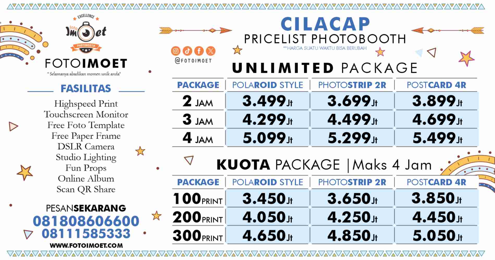 Cilacap - Ada 2 layanan harga photo booth murah Cilacap dari FOTOIMOET yaitu Paket photo booth unlimited dan Photo Booth Kuota, perbedaan nya ada di jam operasional dan banyak lembaran foto yang di cetak. Paket yang jumlah pemotretan tidak terbatas adalah photobooth unlimited, kamu bisa sepuasnya foto dan bergaya di depan kamera selama waktu operasional di paket harga photo booth unlimited Cilacap yang di pesan.