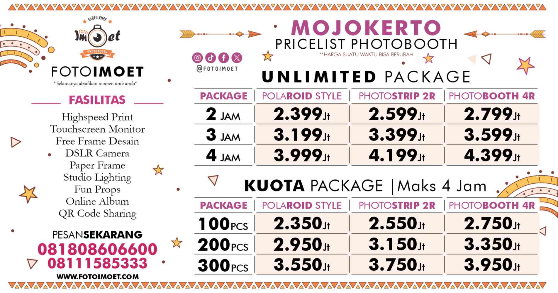 Mojokerto - Ada 2 layanan harga photo booth murah Mojokerto dari FOTOIMOET yaitu Paket photo booth unlimited dan Photo Booth Kuota, perbedaan nya ada di jam operasional dan banyak lembaran foto yang di cetak. Paket yang jumlah pemotretan tidak terbatas adalah photobooth unlimited, kamu bisa sepuasnya foto dan bergaya di depan kamera selama waktu operasional di paket harga photo booth unlimited Mojokerto yang di pesan.