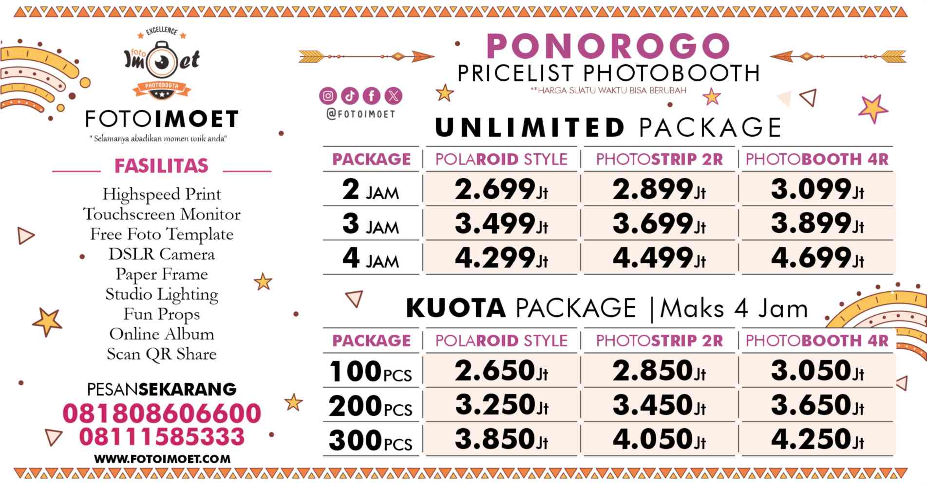 FOTOIMOET Ponorogo melayani paket photo booth event kantor atau apapun yang membutuhkan souvenir foto cetak langsung jadi di Ponorogo dan kota sekitarnya.