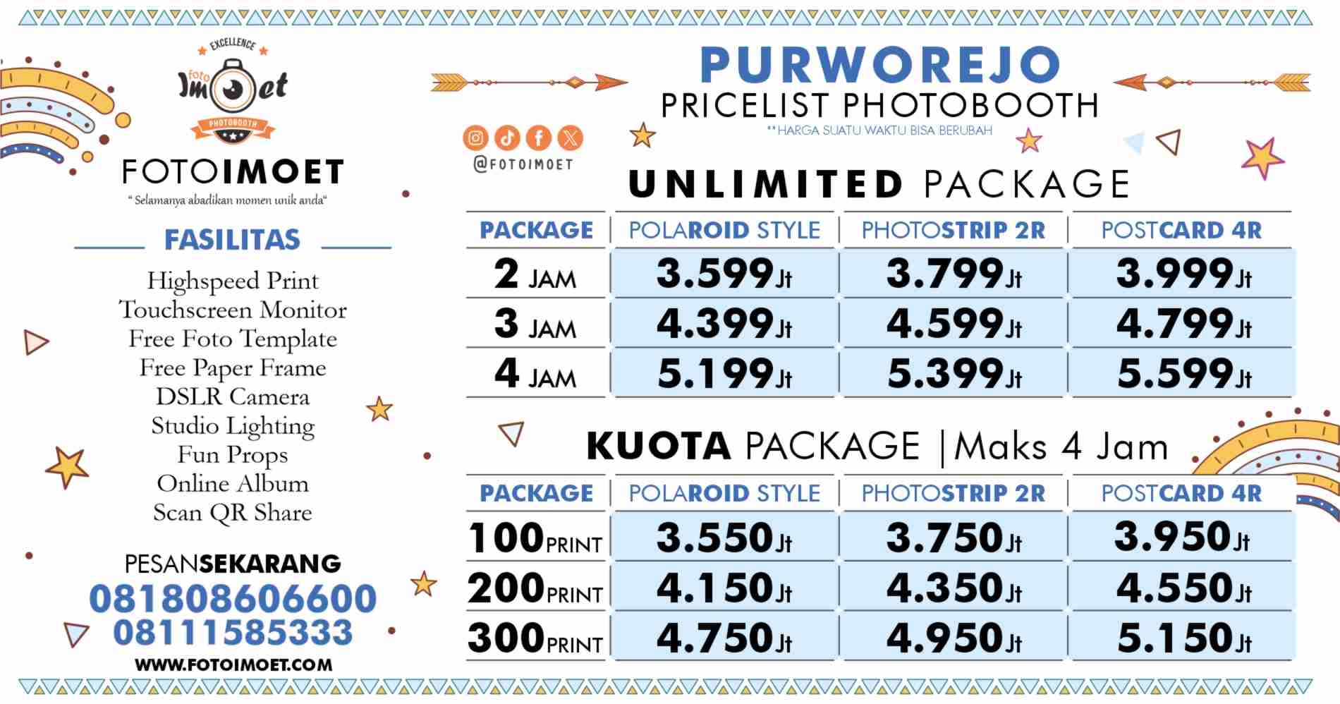 Purworejo - Dua layanan harga photo booth murah Purworejo dari FOTOIMOET yaitu Paket photo booth unlimited dan Photo Booth Kuota, perbedaan nya ada di jam operasional dan banyak lembaran foto yang di cetak. Paket yang jumlah pemotretan tidak terbatas adalah photobooth unlimited, kamu bisa sepuasnya foto dan bergaya di depan kamera selama waktu operasional di paket harga photo booth unlimited Purworejo yang di pesan.