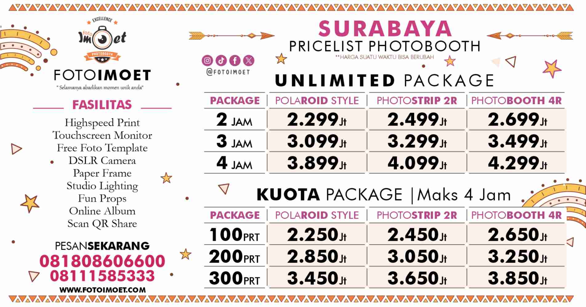 Buat kamu yang sibuk dan mepet waktu buat cari cari vendor photobooth di Surabaya, kami dari FOTOIMOET siap membantu jadi vendor jasa photo booth di wedding kamu, gratis desain template juga ongkos ke lokasi dan ga perlu siapin orang buat urus souvenir photobooth semua dari tim FOTOIMOET yang urus. Ada 2 layanan photobooth yaitu Paket Photo Booth Unlimited dan Photobooth Kuota. Dijamin wedding kamu bakalan jadi MOMENT TERINDAH untuk kamu dan semua tamu undangan, jangan kaget kalo kebawa sampai mimpi hehehehe.